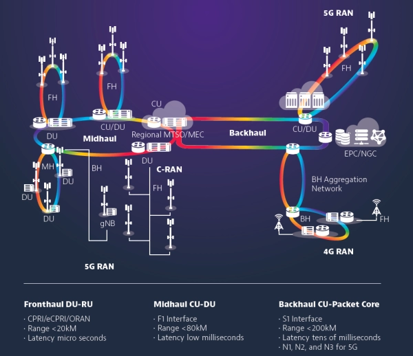 The components of this new architectural model are defined as the RU (previously known as RRH and RRU), Central Unit (CU) and Distributed Unit (DU), with the new link between the CU and DU appropriately referred to as midhaul. RAN virtualization has enabled BBU functions to be located or collocated within the various elements, depending on which functional split between OSI layers best suits the use case requirements. The flexibility of split architecture is essential for optimizing key use cases on 5G fronthaul networks simultaneously.