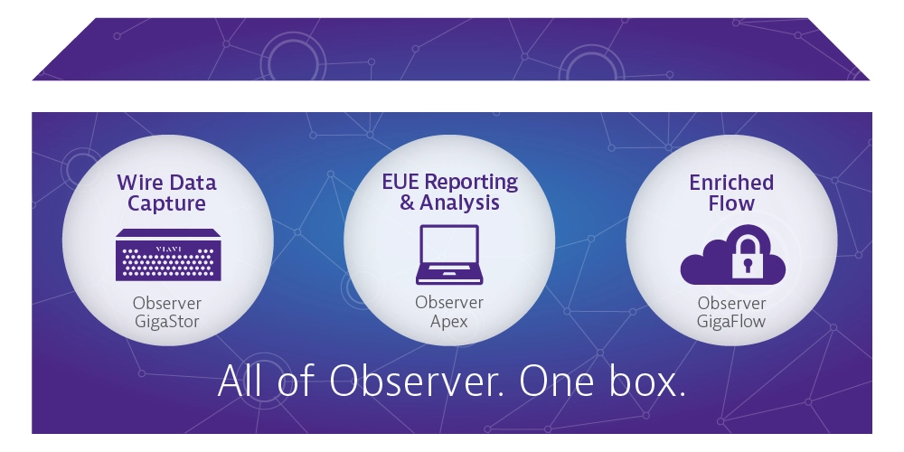 ObserverONE is the VIAVI enterprise solution to empower IT teams to gain the powerful performance and security insights of the entire Observer platform all in one upgradable box. Ideal for deployments where simplicity is key, this appliance combines Apex’s superior visibility to end-user experience with GigaStor’s industry leading wire data and analysis and GigaFlow’s enriched flow analysis. ObserverONE can deliver 10 Gbps stream-to-disk speeds, 10 Gbps of network metadata, and 10K flows per second, offering optimal security and performance management at a cost-effective price point.