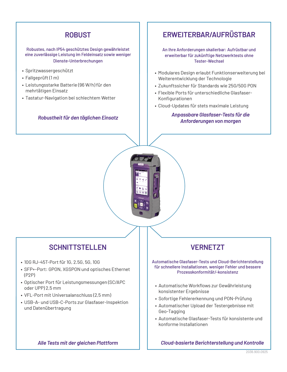 Der OneExpert Fiber (ONX-700) von VIAVI versetzt alle Techniker unabhängig vom Qualifikationsniveau in die Lage, die Leistung von Ethernet-, PON- und WiFi-7-Verbindungen bis 10 Gbit/s in weniger als 1 Minute zu validieren. Diese robuste Komplettlösung trägt dazu bei, Wiederholungsfahrten zum Kunden zu vermeiden und die Bereitstellung der Dienste im Anschlussbereich zu beschleunigen. Mit seiner modularen Flexibilität und der VIAVI Testprozess-Automatisierung (TPA) gewährleistet der OneExpert Fiber (ONX-700) die Prozesskonformität, indem er die Techniker zuverlässig durch den Workflow führt und die Testverfahren standardisiert. Auf diese Weise sind auf einfachen Tastendruck stets professionelle Messergebnisse sichergestellt. Damit erweist sich dieses Tool als unverzichtbar für die schnelle und verlässliche Multi-Gigabit-Aktivierung von PON-Netzen.