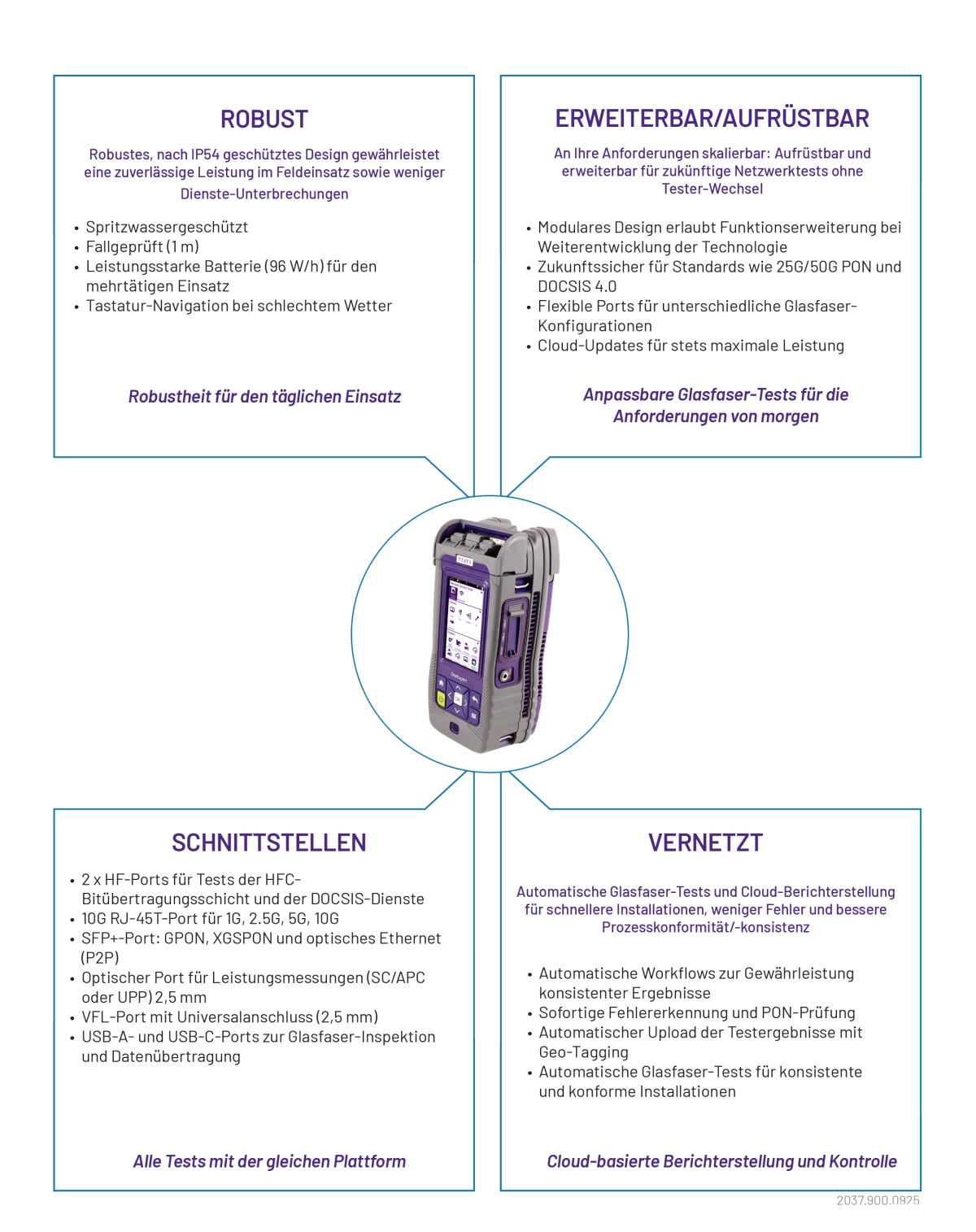 Kombiniert Ethernet-, Glasfaser-, DOCSIS- und WiFi-7-Tests im gleichen kompakten Gerät, sodass nicht mehr mehrere Einzelgeräte in den Einsatz mitgenommen werden müssen.