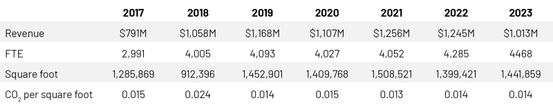 As the table below shows, our Scope 1 and Scope 2 CO2 emissions intensity has decreased between 2017 and 2023 on a per-employee (FTE) basis. This demonstrates a positive trend of reducing emissions per employee as our workforce has grown. However, our CO2 emissions intensity on a revenue basis remained relatively stable during this same period. We are exploring further strategies to achieve CO2 reductions across all metrics.