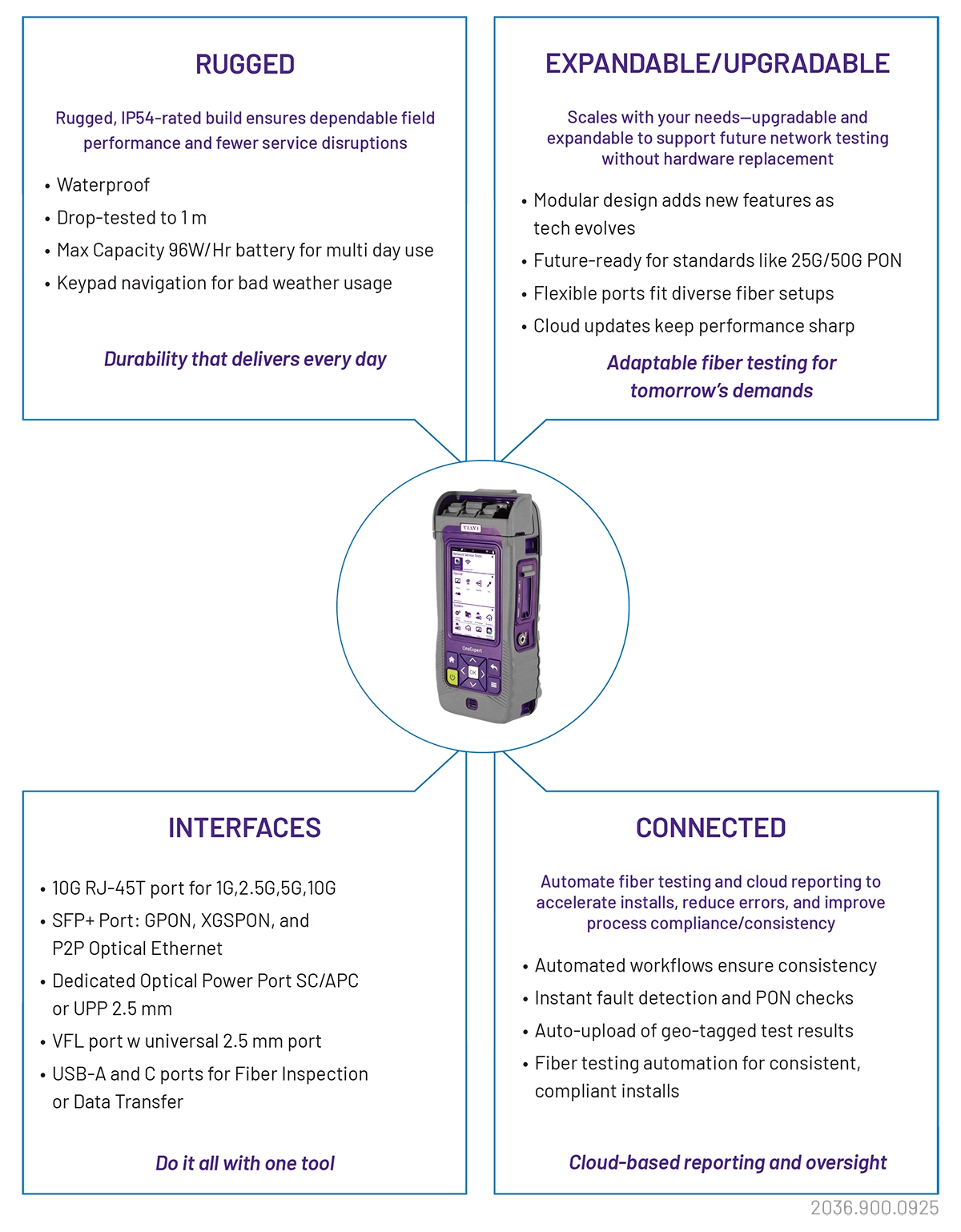 The OneExpert Fiber (ONX-700) from VIAVI empowers technicians of any skill level to validate Ethernet, PON, and WiFi 7 performance up to 10 Gbps in under a minute. This rugged all-in-one solution helps reduce repeat visits and accelerate service delivery across the last mile. With modular flexibility and VIAVI Test Process Automation (TPA), OneExpert Fiber (ONX-700) ensures technician process compliance by guiding workflows and standardizing test procedures—delivering expert-level results with one-button simplicity. It’s the go-to tool for fast, reliable multi-gig PON activation.