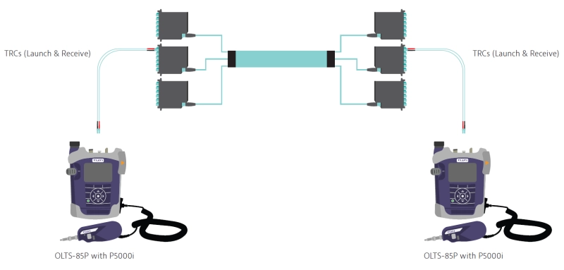 Dans un environnement utilisant une procédure basée sur des outils traditionnels, l’OLTS classique dispose de ports d’entrée LC ou SC. Dans ce scénario, il n’est pas possible de brancher un connecteur MPO directement sur l’instrument de test. Pour y remédier, un assemblage de câbles éclateurs/de séparation supplémentaire est ajouté entre le connecteur MPO et les câbles de référence de test (TRC) connectés au port de l’instrument de test. Ces types de câbles hybrides sont nécessaires pour effectuer des tests de connecteurs MPO avec des instruments de test traditionnels ; le processus devient alors inutilement compliqué (comme vous pouvez le voir sur le schéma ci-dessous).