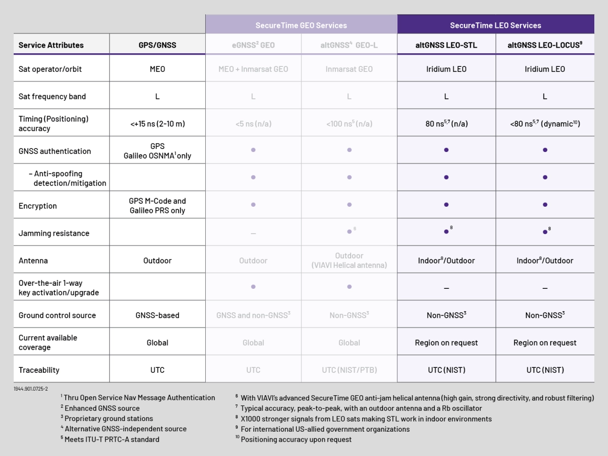 The following table highlights key points of comparison between VIAVI SecureTime LEO Services and GPS/GNSS. Select the Options tab for additional information about each SecureTime LEO Service.