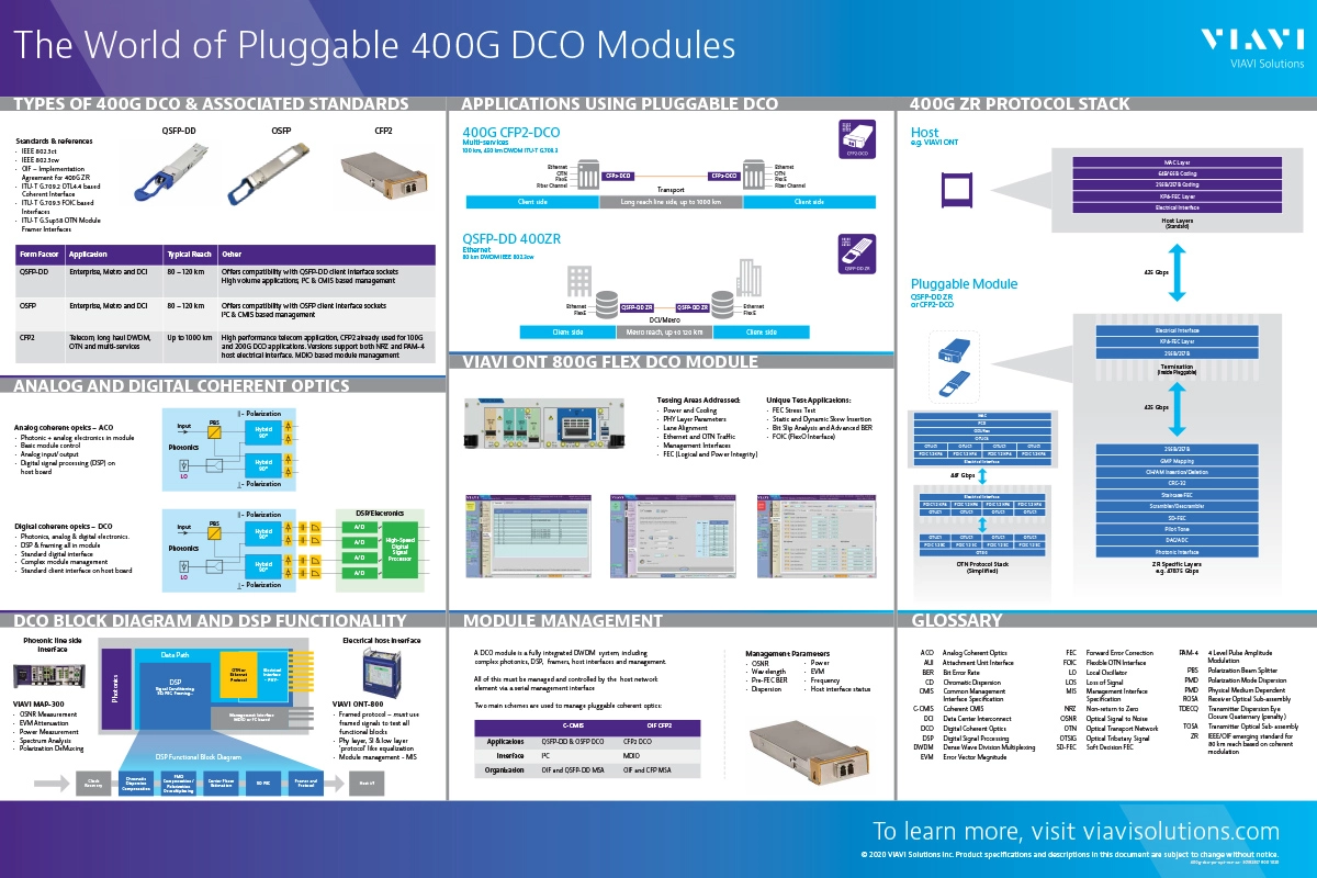• Pluggable Coherent for Ethernet: Emerging applications such as datacenter interconnect DCI are driving the use of pluggable coherent modules for Ethernet, especially at 400GE. The increased complexity of managing, developing, integrating, and operating these modules presents new challenges over and above high-speed Ethernet. VIAVI have considerable expertise with pluggable coherent optics over the complete lifecycle, including ZR optics.