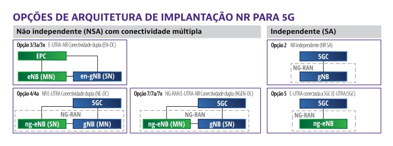 Preencher a lacuna entre o 4G e o 5G requer passos gradativos e um plano de trabalho bem orquestrado. Um sinal claro desta mudança é a transição gradual do modo não independente para o modo independente das opções da arquitetura 5G. O padrão 5G não independente foi concluído no final de 2017 e utiliza redes LTE RAN existentes e redes core como uma âncora, com a adição da portadora de componente 5G. A despeito da confiança na arquitetura 4G, o modo não independente aumenta a largura de banda ao utilizar frequências de ondas de milímetros.