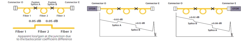 Se a transição na junção da fibra resultar em uma fibra com um coeficiente de retroespalhamento mais baixo passando para uma fibra com coeficiente mais alto, o resultado pode ser um mascaramento da perda real na interface ou emenda. Esse mascaramento ou efeito de distorção também é conhecido como ganho, pois a quantidade de retroespalhamento observada será maior após o evento de perda do que era antes. Da mesma forma, se a transição for de um segmento com coeficiente de retroespalhamento mais elevado para um mais baixo, a assinatura resultante poderia mostrar incorretamente um evento de perda mais elevada nesse mesmo local. Tirar a média dos valores obtidos em lados opostos pode propiciar um cálculo mais preciso da perda.