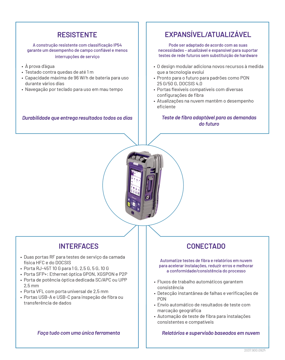 Combina testes de Ethernet, fibra, DOCSIS e Wi-Fi 7 em um único dispositivo, eliminando a necessidade de várias ferramentas.
