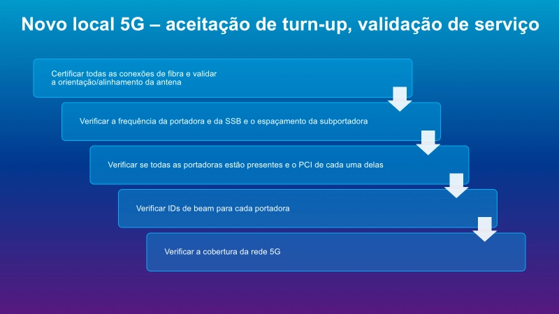 O 5G transformou todos os elementos da infraestrutura de rede wireless. Isso inclui fibra, RAN, transporte e gestão de ativos. Cada fase da implantação do 5G NR agora requer um kit de ferramentas especializado para suportar a implementação. Os operadores desenvolveram seu próprio método de procedimento individual (MOP). A abordagem mais abrangente para testes de fibra, verificação OTA, análise de beam, cobertura e testes de throughput é frequentemente o mais bem-sucedido; apenas uma única rede móvel com baixo desempenho pode atrasar o lançamento de uma implantação completa em grande escala.